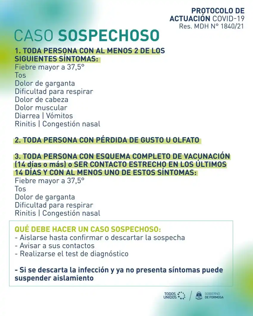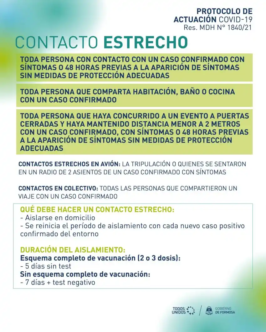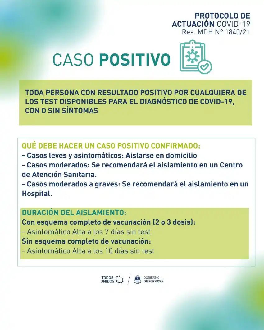 Este jueves al mediodía, el Gobierno de la Provincia de Formosa, dio a conocer el nuevo protocolo sanitario para el manejo de casos positivos de coronavirus y sus contactos estrechos, que se aplicará en todo el territorio formoseño, dependiendo de la situación.