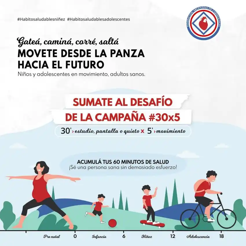 Como parte de su campaña de salud por el Día del Niño, la Federación Argentina de Cardiología (FAC) realizará una serie de actividades en sus redes sociales para incentivar a padres, niños y adolescentes al cuidado de la salud cardiovascular. Esta campaña, que forma parte del “Desafío 30X5”: 30 minutos (estudio, pantalla o quieto) x 5 minutos (movimiento) invita a invertir en movimiento, fortalecer las defensas y acumular 60 minutos de salud y ser una persona sana sin demasiado esfuerzo.