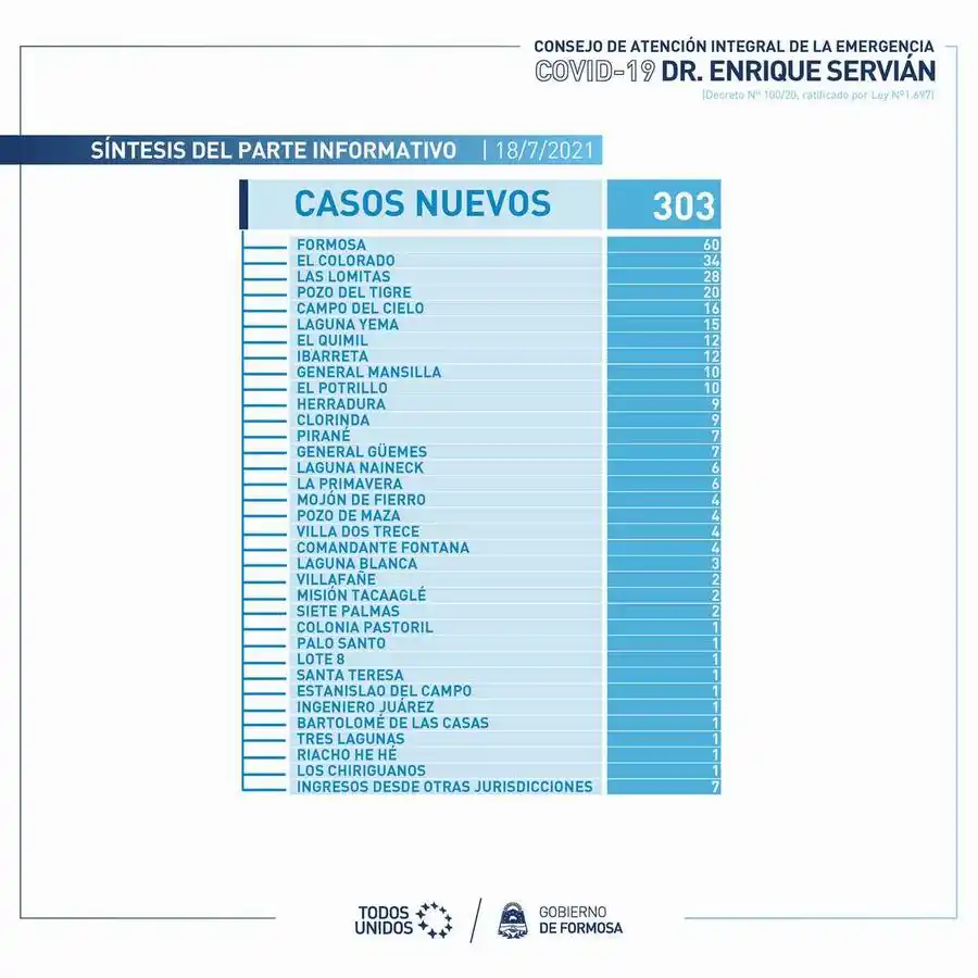 A su vez, en General Mansilla y El Potrillo hubo 10 nuevos casos; en Herradura y Clorinda 9; en Pirané y General Güemes 7; en Laguna Naineck y La Primavera 6; en Mojón de Fierro, Pozo de Maza, Villa Dos Trece y Comandante Fontana 4; y en Laguna Blanca 3.