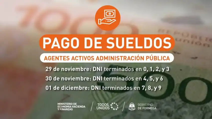 El día martes 30 se abonarán los sueldos de los titulares de DNI con terminaciones 4, 5 y 6, en tanto que el miércoles 1º de diciembre concluirá la atención a los agentes con documentos finalizados en 7, 8 y 9.