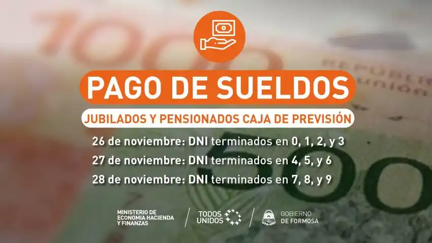 El próximo viernes 26 se dará comienzo al pago de las remuneraciones correspondientes de los agentes estatales correspondientes al mes de noviembre.