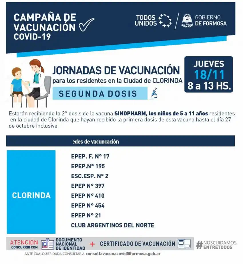 En cumplimiento con la campaña estratégica de vacunación contra el COVID 19, el próximo jueves 18, recibirán la segunda dosis de la vacuna Sinopharm, los niños y niñas de 5 a 11 años, residentes en la ciudad de Clorinda, que se hayan aplicado la primera dosis de esta vacuna hasta el día 27 de octubre inclusive.
