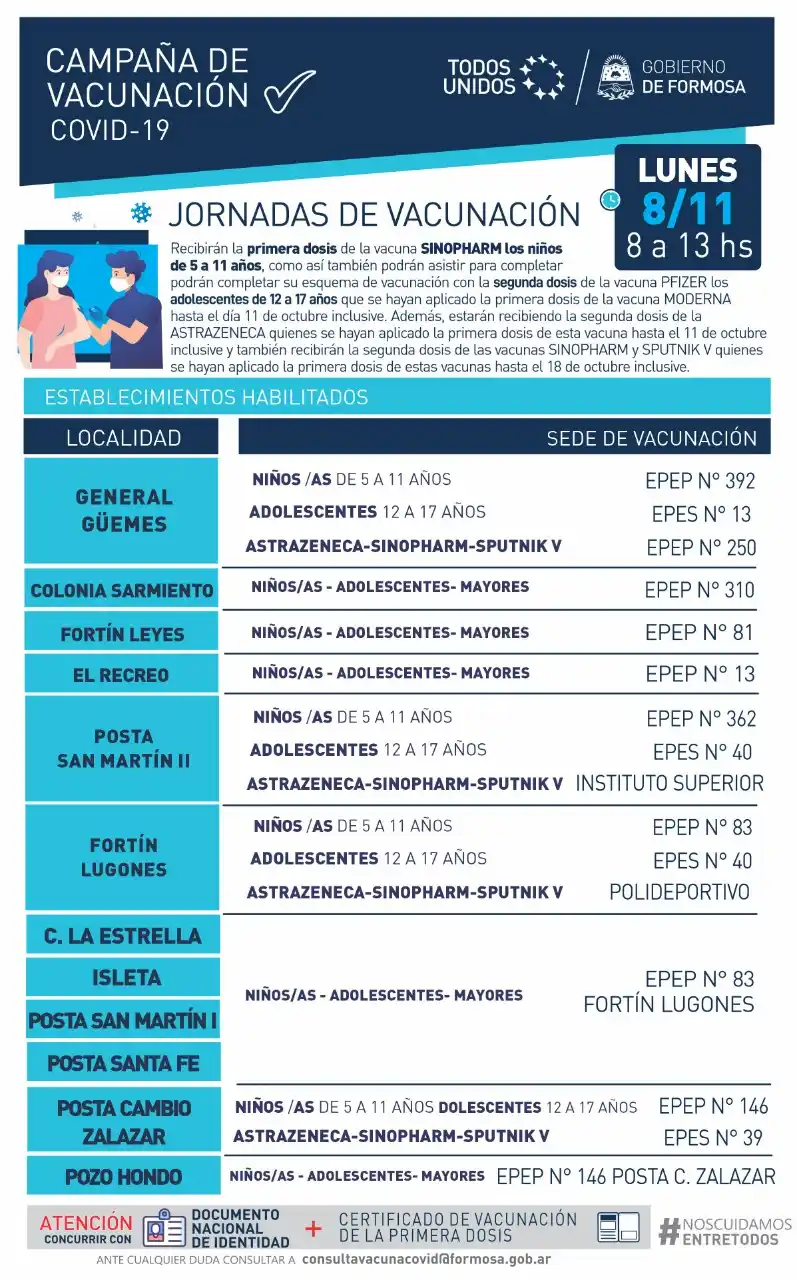 En ese marco, el día lunes 8 de noviembre estarán recibiendo la primera dosis de la vacuna Sinopharm los niños de 5 a 11 años residentes en las localidades de Gral. Güemes, Colonia Sarmiento, Fortín Leyes, El Recreo, San Martín II, Fortín Lugones, Colonia La Estrella, Isleta, Posta San Martín I, Posta Santa Fe, Posta Cambio Zalazar, Pozo Hondo.