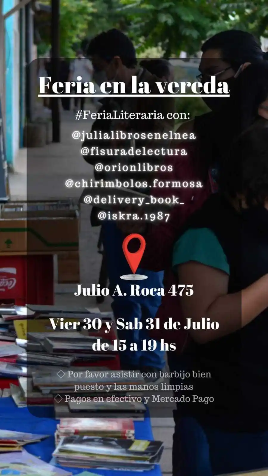 En la movida cultural del finde otra propuesta tiene que ver con la Feria Literaria en la vereda, que se realizará hoy y mañana en Julio A. Roca 475, de 15 a 19 horas, con la participación de Julia Libros en el NEA, Fisura de lectura, Orión Libros, Chirimbolos Formosa, Delibery Book e Iskra. Y desde el Plan de Lecturas Formosa este fin de semana se prepara otro encuentro con los libros en la plaza San Martín.