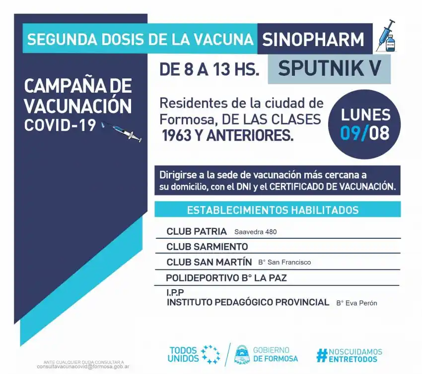 Este lunes 9 de agosto se aplicará la segunda dosis de la vacuna Sputnik V y Sinopharm a los residentes de la ciudad de Formosa, de las clases 1963 y anteriores.