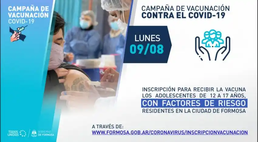 Además, el día domingo 15 de agosto se avanzará en todo el territorio provincial con la vacunación de los adolescentes de 12 a 17 años con factores de riesgo que se hayan inscripto y hayan sido aprobados por las autoridades sanitarias para recibir la vacuna contra el COVID-19.