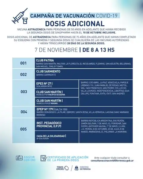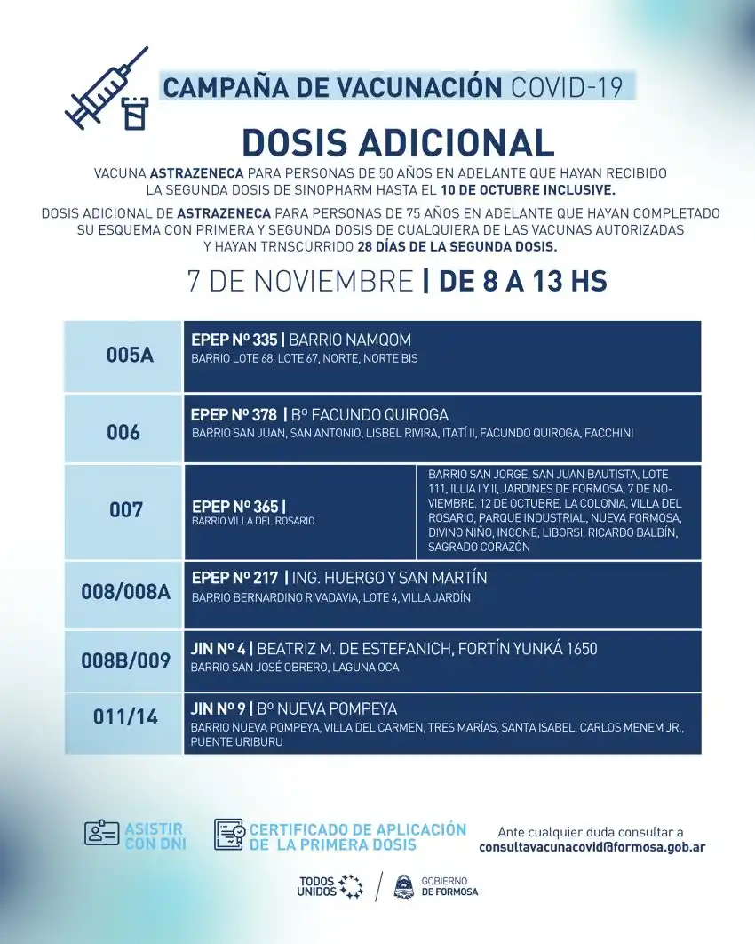 Los comprovincianos de Lote 68, Lote 67, Norte y Norte Bis recibirán la dosis adicional en la EPEP N° 335 del barrio Namqom y en la EPEP N° 378 del barrio Facundo Quiroga, los que viven en el San Juan, San Antonio, Lisbel Rivira, Itatí II, Facundo Quiroga y Facchini.
