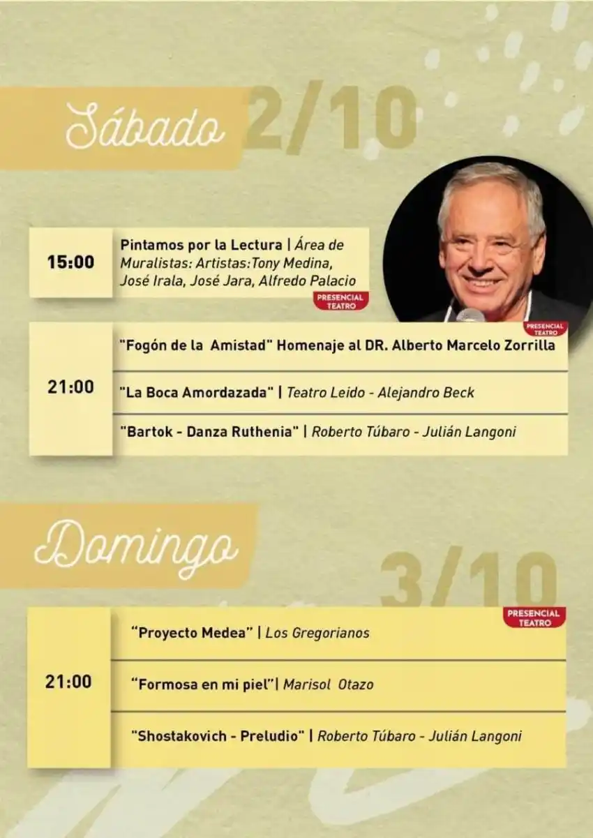 Hasta el 3 de octubre se presentarán 120 obras, 32 escritoras, 28 escritores y 40 editoriales de libros. Participan 20 editoriales, habrá 15 conversatorios, 20 talleres, 8 proyectos educativos, 5 revistas y 10 presentaciones artísticas, entre las que se destacan mañana sábado, desde las 21 en el Teatro de la Ciudad, El fogón de la amistad, homenaje al doctor Alberto Zorrilla con la participación de músicos amigos; La boca amordazada, teatro leído con Alejandro Beck, y Bartok, danza ruthenia, con Roberto Túbaro y Julián Lagoni.